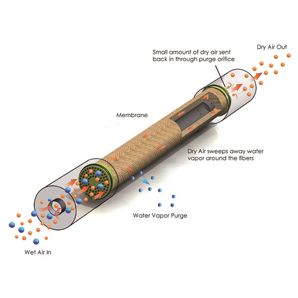 A membrane air dryer is an industrial device that is used to remove moisture from air before it enters a compressed air system. The dryer consists of a series of hollow fibers which are designed to absorb and remove moisture from the air. The fibers are made from a semi-permeable material, meaning that only water molecules can pass through the membrane, while air is blocked. As air passes through the dryer, the moisture is drawn out of the air, leaving it dry and free of moisture.